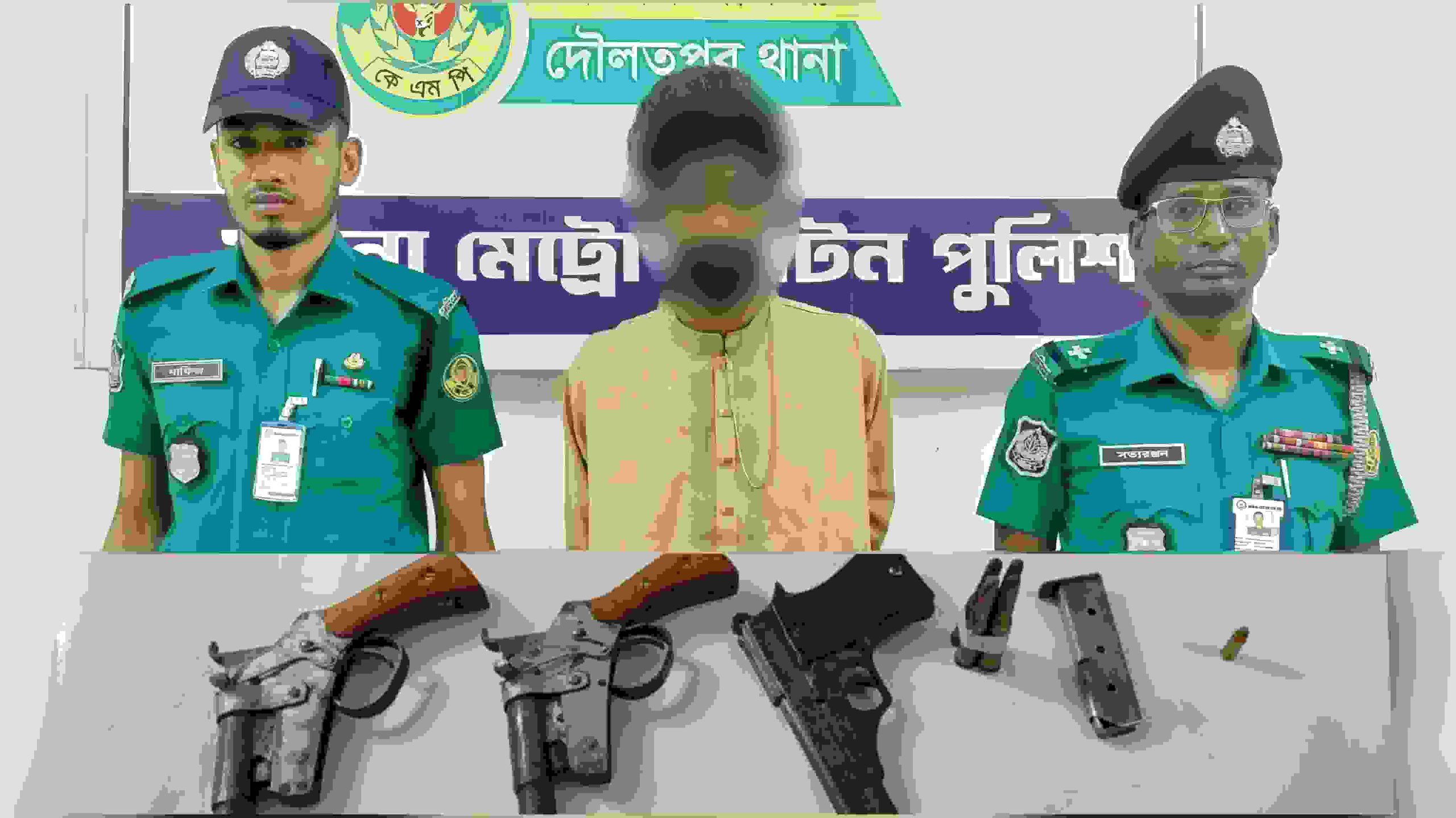 কেএমপি’র দৌলতপুর থানা পুলিশের একটি চৌকস আভিযানিক টিম ও মহানগর গোয়েন্দা পুলিশের সহায়তায় ০৪ এপ্রিল ২০২৬ তারিখ দিবাগত রাতে গোপন সংবাদের ভিত্তিতে রায়েরমহল এলাকায় অভিযান পরিচালনা করে শীর্ষ সন্ত্রাসী ইমন হাওলাদার@গজাল ইমন (২৩), পিতা-আলমগীর হোসেন, সাং-মহেশ্বরপাশা বুচিতলা, থানা-দৌলতপুর, খুলনাকে গ্রেফতার করে। গ্রেফতারকৃত সন্ত্রাসীকে জিজ্ঞাসাবাদের ভিত্তিতে মহেশ্বরপাশা কার্তিককূল উত্তর ঘোষপাড়া এলাকা হতে রাত ০৪.৩০ ঘটিকায় অভিযান চালিয়ে ২ টি ওয়ান শুটার গান, ১টি পিস্তল, ১টি ম্যাগাজিন, ১ রাউন্ড পিস্তলের কার্তুজ এবং ৪ রাউন্ড ওয়ান শুটার গানের কার্তুজ উদ্ধার করা হয়। তার বিরুদ্ধে আইনগত ব্যবস্থা প্রক্রিয়াধীন।