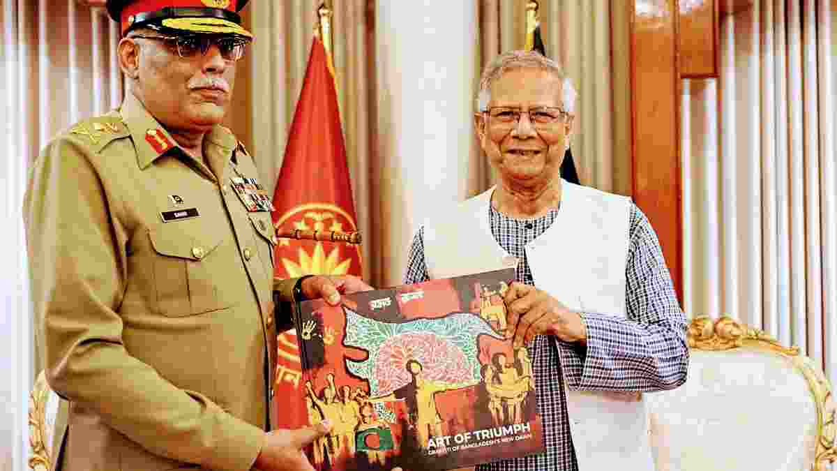 বাংলাদেশের প্রধান উপদেষ্টা ড. মুহাম্মদ ইউনূস সম্প্রতি পাকিস্তানের জয়েন্ট চিফস অফ স্টাফ কমিটির (জেসিএসসি) চেয়ারম্যান জেনারেল সাহির শামশাদ মির্জাকে একটি বই উপহার দেওয়ায় ভারতে তীব্র বিতর্ক সৃষ্টি হয়েছে। ‘দ্য আর্ট অফ ট্রায়াম্ফ: গ্রাফিতি অফ বাংলাদেশ’স নিউ ডন’ শীর্ষক বইটির প্রচ্ছদ নিয়ে দেশটির সামাজিক যোগাযোগ মাধ্যমে তোলপাড় চলছে। এ নিয়ে প্রতিবেদন করতে দেখা গেছে ডজনেরও অধিক ভারতীয় গণমাধ্যমকে।ভারতীয় গণমাধ্যম ও নেটনাগরিকদের অভিযোগ, বইটির প্রচ্ছদে বাংলাদেশের যে গ্রাফিতি মানচিত্র ব্যবহার করা হয়েছে, তাতে বিকৃতি রয়েছে। এতে ভারতের সাতটি উত্তর-পূর্ব রাজ্যের (‘সেভেন সিস্টার্স’) কিছু অংশকে বাংলাদেশের অংশ হিসেবে দেখানো হয়েছে বলে দাবি করা হয়েছে। মানচিত্রটিকে ‘বৃহত্তর বাংলাদেশ’ ধারণার প্রতীক হিসেবে অপপ্রচার করতে দেখা গেছে ভারতীয় গণমাধ্যম ও সামাজিক মাধ্যম ব্যবহারকারীদের।